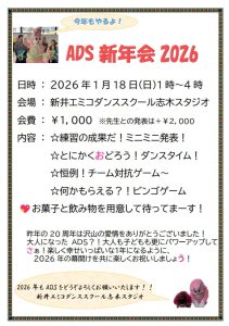 2025/12/10 ADS新年会のお知らせ🌟2026/1/18 🌟ADS新年会2026🌟日程決定しましたよ~ 2026年1月18日(日)13:00~16:00(予定) 会場:新井エミコダンススクール志木スタジオ 会費:¥1,000 また新たな年を元気に愉快に過ごせるように 一緒にスタート行事を楽しみましょう💖 みんな参加してね~~~🌟